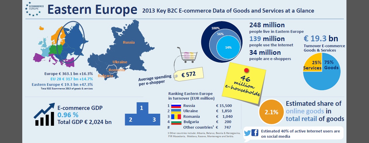 • în 2012, 28 de milioane de persoane din Europa de Est cumpărau online (17% din populația din această zona), iar, în 2013, numărul acestora a crescut la 34 de milioane;