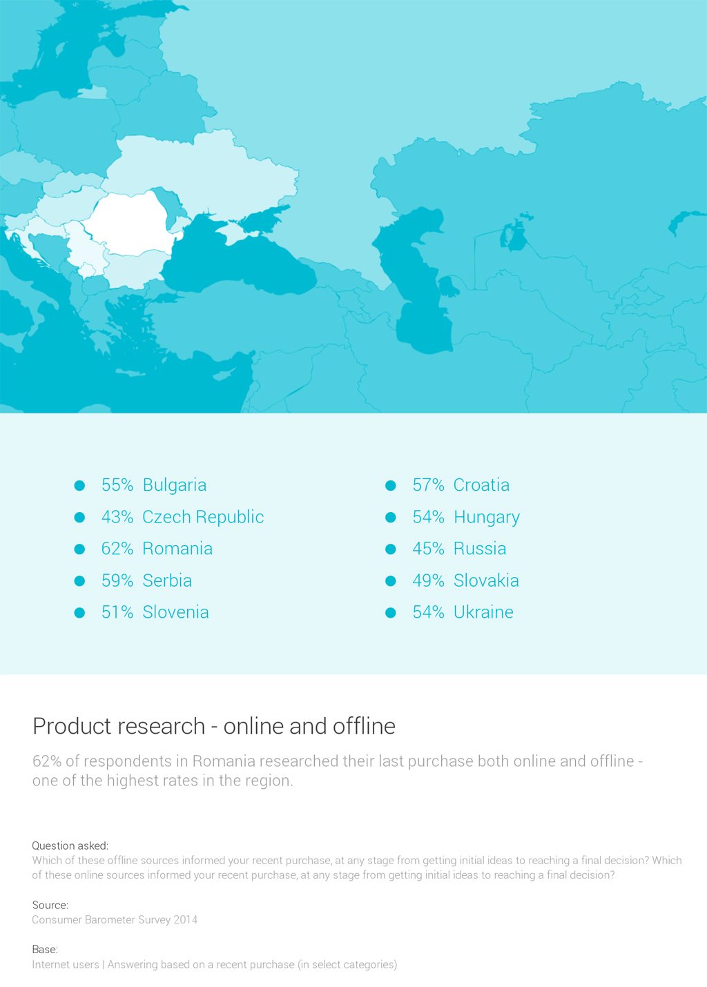 - 62% dintre cei care au răspuns la chestionar s-au documentat online și offline despre produsul dorit înainte de achiziție, cel mai mare procent din Europa de Est.