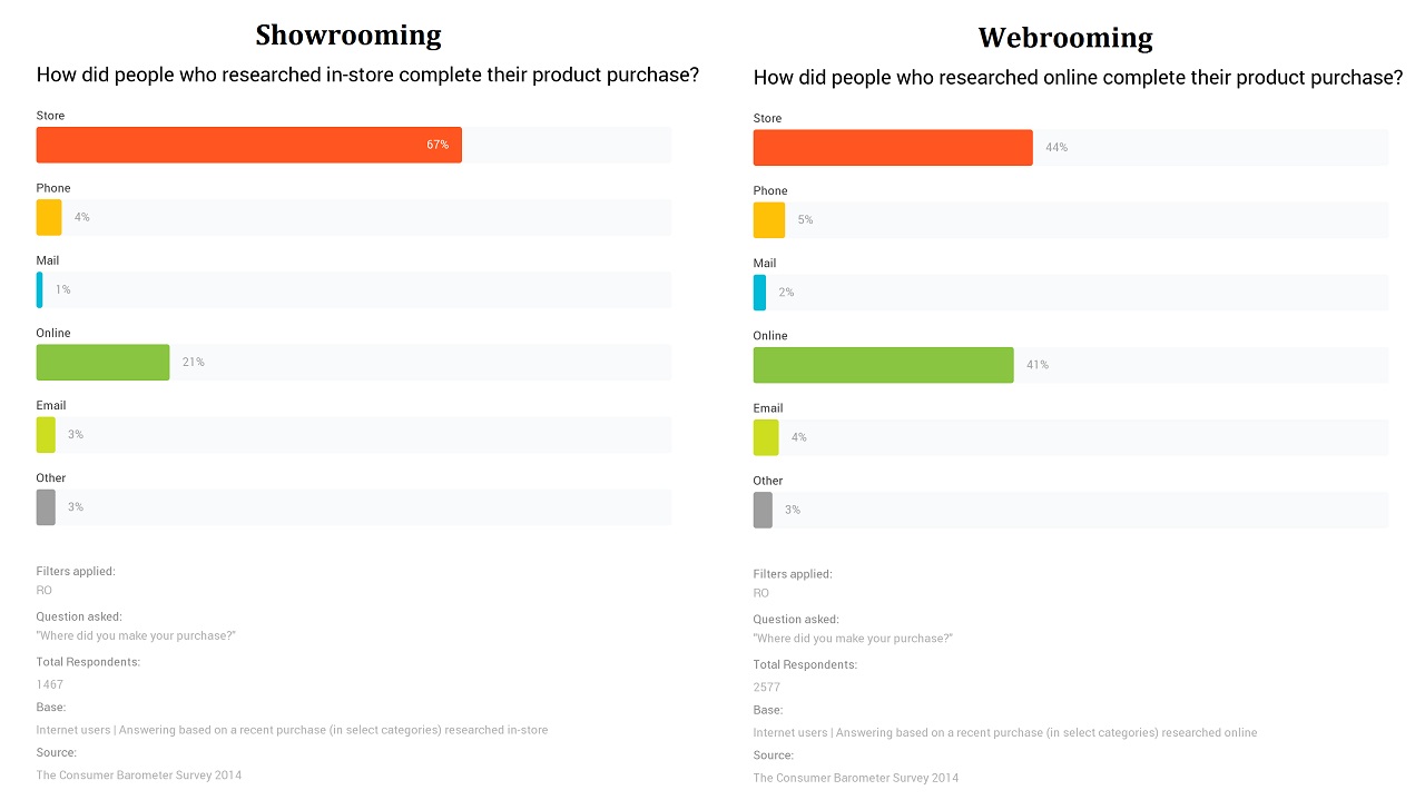 - 44% dintre participanți au declarat că practică webrooming-ul (se documentează online și cumpără din magazin) pentru anumite categorii de produse: 64% în cazul biletelor de cinema, 51% – electrocasnicelor, 44% – alimentelor, 32% – vestimentație.
