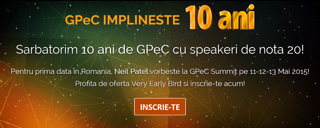 “In 2015 sarbatorim 10 ani de existenta GPeC cu speakeri de nota 20! Suntem mandri sa fim primii care il aduc in Romania pe Neil Patel, dar surprizele nu se opresc aici – urmeaza sa dezvaluim nume la fel de sonore care vor urca pe scena GPeC Summit 2015, asadar ii sfatuiesc pe toti cei care activeaza in industrie sa isi rezerve locul in sala de pe acum”, spune Andrei Radu, CEO & Founder GPeC.