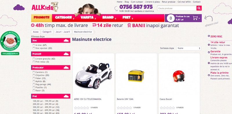 Allkids.ro oferă logo-ului TRUSTED.ro o poziție privilegiată în site. Acesta este plasat în partea stângă, pe o poziție fixă. Clientul va fi conștient, pe parcursul vizitei sale, că va cumpăra de la un magazin în care poate avea încredere.