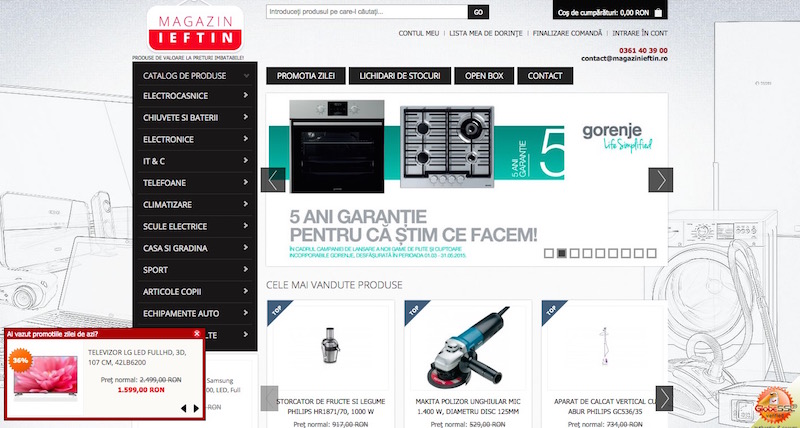 Când intri pe site-ul Magazinieftin.ro, îți atrage atenția fereastra din stânga jos cu promoțiile zilei. Poți naviga prin ele apăsând pe săgețile stânga-dreapta sau, dacă nu ești interesat, poți închide fereastra. Iată o metodă neintruzivă de a anunța reducerile momentului!