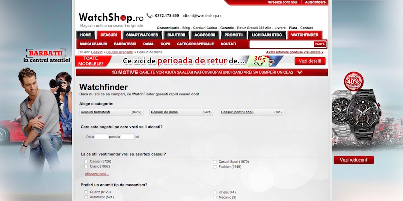 Și Watchshop.ro folosește filtrul de căutare. Din prima pagină, ești trimis într-o pagină specială în care există un formular de căutare complex. De acolo selectezi stilul vestimentar la care vrei să asortezi ceasul dorit, bugetul alocat achiziției și chiar timpul în care dorești să-ți ajungă produsul acasă.