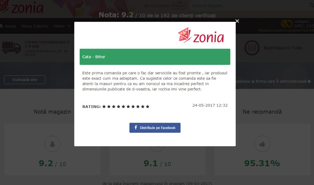„Este prima comanda pe care o fac de la Zonia.ro dar serviciile au fost promte, iar produsul este exact cum ma asteptam. Ca sugestie celor ce comanda este sa fie atenti la masuri pentru ca eu am norocul sa ma incadrez perfect in dimensiunile publicate de d-voastra, iar rochia imi vine perfect”, scrie Cata din Bihor (link opinie).