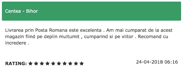 „Livrarea prin Posta Romana este excelenta. Am mai cumparat de la acest magazin fiind pe deplin multumit, cumparind si pe viitor. Recomand cu incredere.”