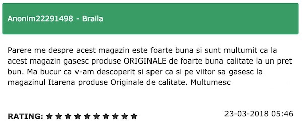 „Parerea mea despre acest magazin este foarte buna si sunt multumit ca la acest magazin gasesc produse ORIGINALE de foarte buna calitate la un pret bun. Ma bucur ca v-am descoperit si sper ca si pe viitor sa gasesc la magazinul Itarena produse originale de calitate.”
