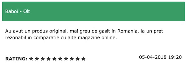 „Au avut un produs original, mai greu de gasit in Romania, la un pret rezonabil in comparatie cu alte magazine online.”