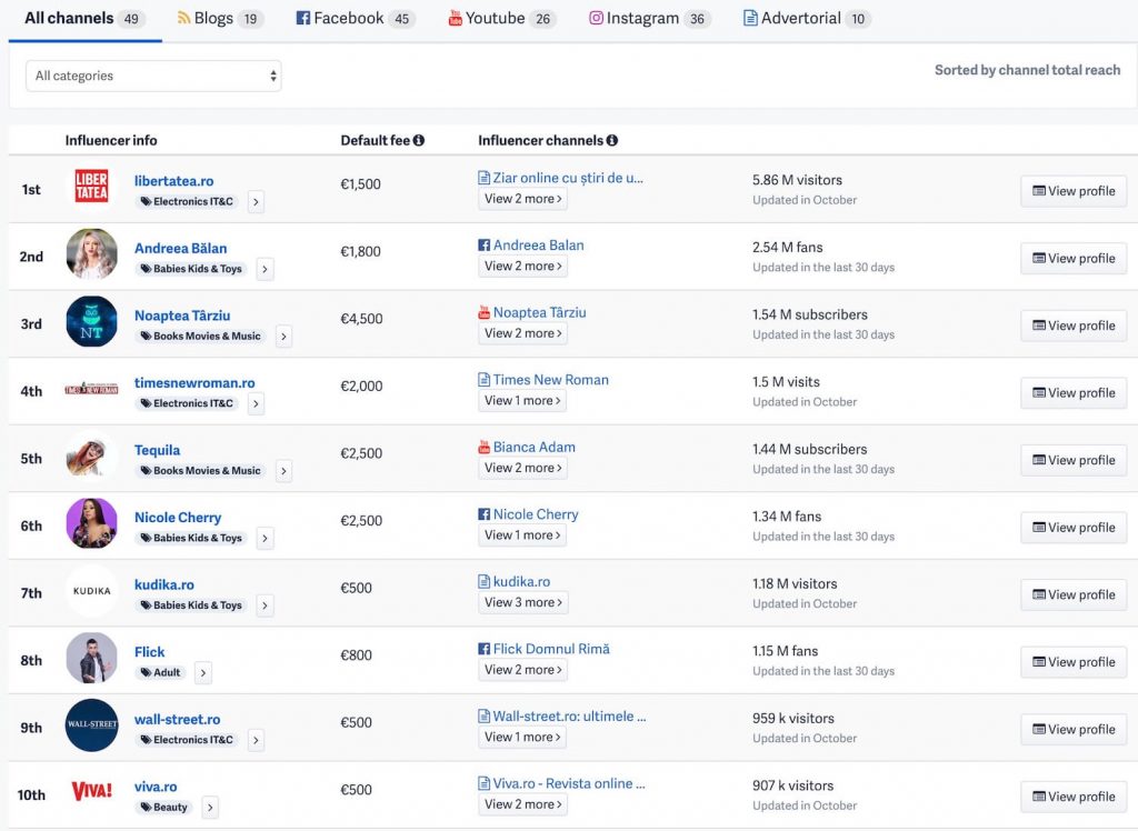 Printre primii influenceri și creatori de conținut listați în platformă se află:
