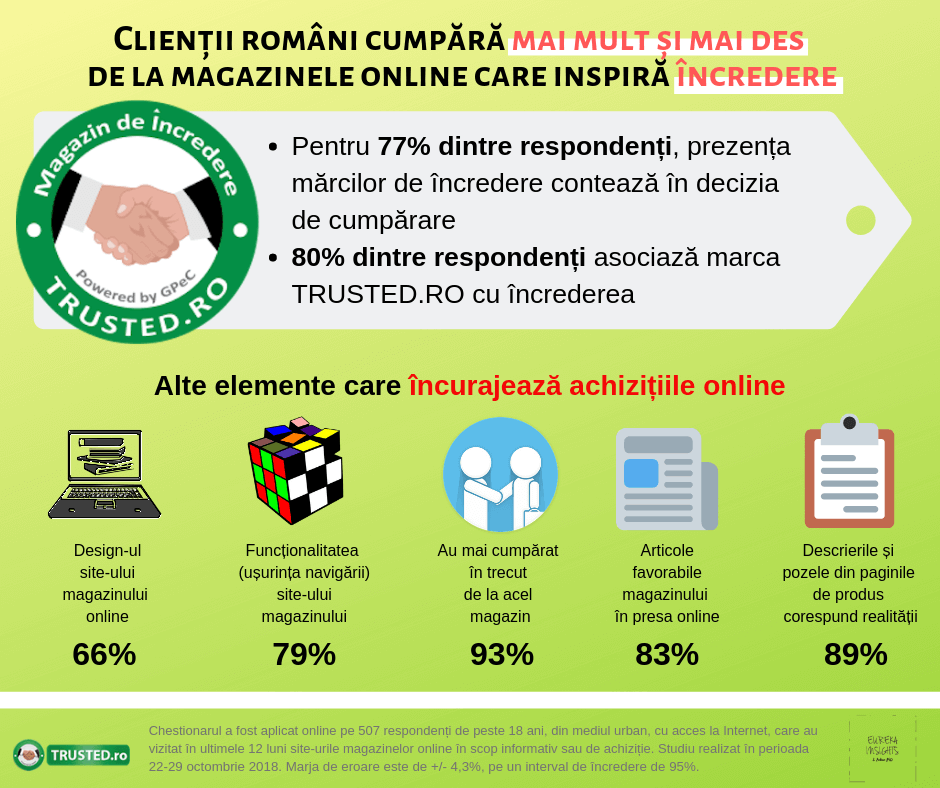 Mărcile afișate pe site-urile magazinelor online influențează decizia de cumpărare a clienților români, potrivit unei cercetări realizate de Eureka Insights și TRUSTED.RO. Mărcile de încredere sunt un factor care influențează pozitiv încrederea în magazine pentru 77% dintre respondenți.