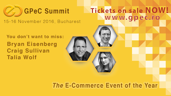 Pe 16 Noiembrie te așteaptă o Premieră în piața românească de e-commerce: pentru prima dată, aducem conceptul “GPeC Special Guest Event”, dedicându-i o zi întreagă lui Bryan Eisenberg, omul care a contribuit la creșterea Amazon.com. Este o zi pe care niciun magazin online sau antreprenor nu ar trebui să o rateze, Bryan fiind unul dintre pilonii internaționali ai Marketing-ului Online și al Optimizării Ratei de Conversie, recunoscut ca Guru în User Experience și menționat în discursurile lor de majoritatea specialiștilor worldwide în Digital Marketing.